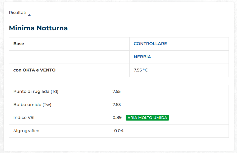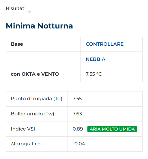 A differenza dei calcolatori basati sull’equazione di Brunt e sul punto di rugiada, ISG integra il contenuto di vapore, la memoria secca dell’atmosfera e la durata della notte per una lettura coerente del contesto reale.